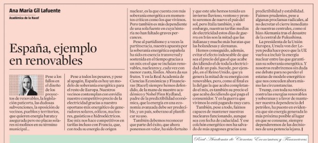 Ana María Gil, Académica de Número, Bibliotecaria de la Junta de Gobierno y Directora del Observatorio de Investigación de la Real Academia de Ciencias Económicas y Financieras (RACEF), destaca en el artículo "España, ejemplo en renovables", publicado el