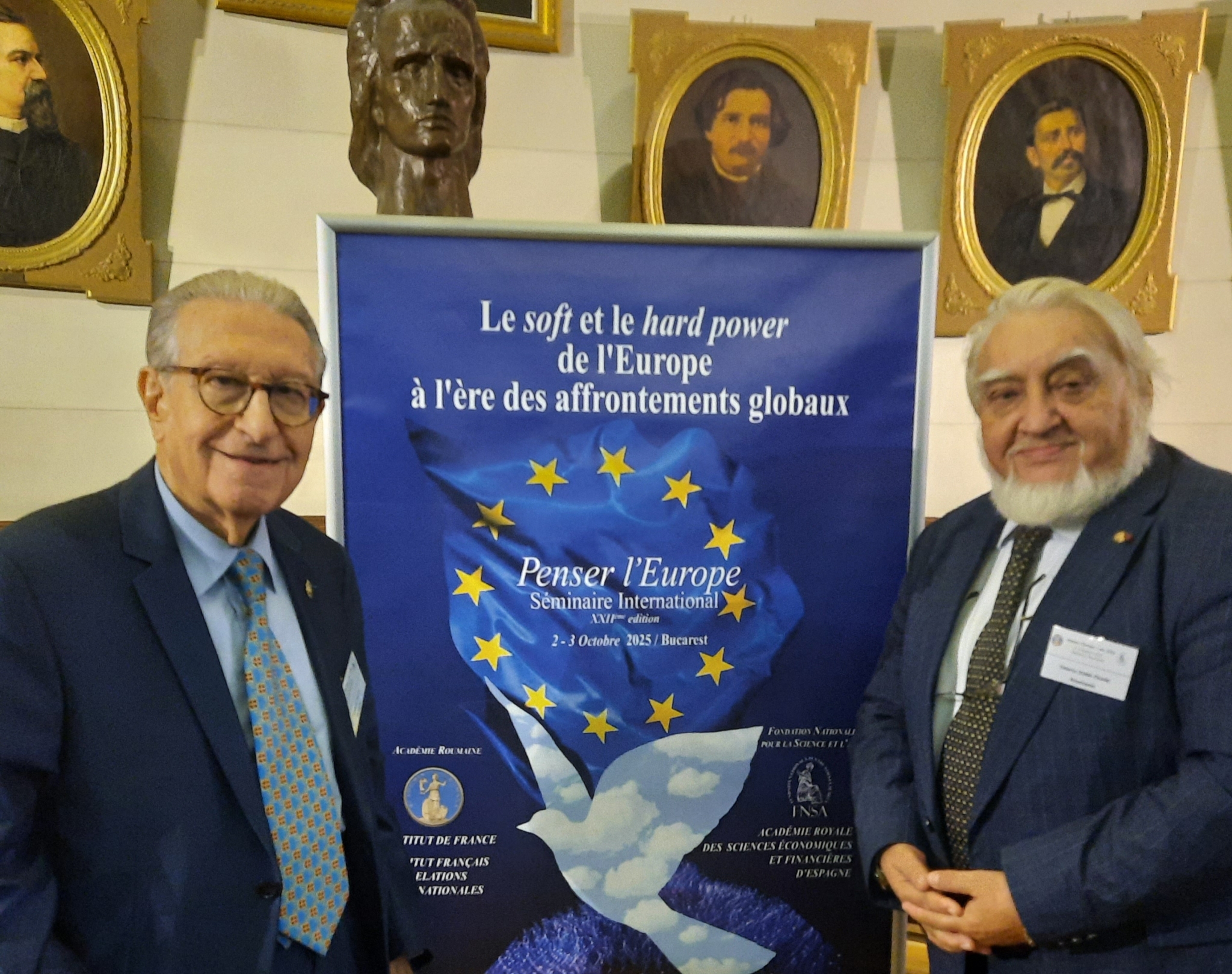 Jaime Gil Aluja, Presidente de la Real Academia de Ciencias Económicas y Financieras (RACEF), ha reflexionado sobre el papel de Europa en un escenario global marcado por la creciente interdependencia y la reconfiguración de los grandes polos de poder en su intervención en el Seminario Internacional "Penser l'Europe", que la Fundación Nacional para las Ciencias y las Artes de la Academia Rumana celebrará en Bucarest con la colaboración de la RACEF entre el 1 y 3 de octubre. Valeriu Ioan-Franc, Académico Correspondiente para Rumanía de la RACEF y miembro del Comité Organizador, ha ejercido de anfitrión. [+]