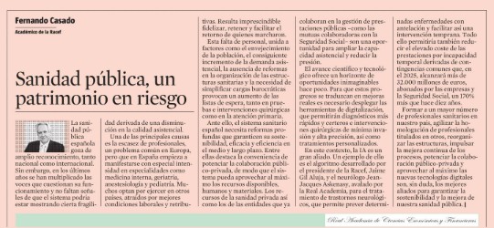 Fernando Casado, Académico de Número y Secretario de la Junta de Gobierno de la Real Academia de Ciencias Económicas y Financieras (RACEF), pide avanzar en la digitalización e implementación de nuevas tecnologías en el sistema sanitario español así como en reforzar la colaboración público-privada en la tribuna de opinión que la Real Corporación publica en el suplemento económico "Dinero" del diario "La Vanguardia". Casado es un gran conocedor del sector en tanto que Presidente de la mutua Asepeyo y de la Asociación de Mutuas de Accidentes de Trabajo y Enfermedades Profesionales de la Seguridad Social. [+]